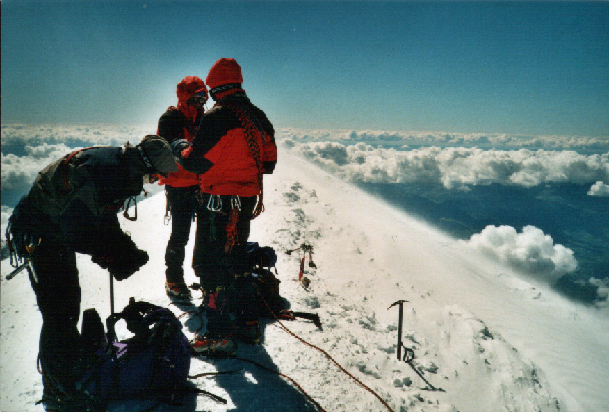 Trasa výstupu: Překonání úvodních puklin Bossonského ledovce. Dolní část Bossonského ledovce. Pohled z Bossonského ledovce nad chatou Grands Mulets dolu na Chamonix. Horní část Bossonského ledovce s výhledem na vrchol. Podvečer u chaty Vallot, 4200m. Nástup k vrcholu od chaty Vallot. Podvečer na vrcholu, po sólo výstupu. Další den na vrcholu, s logem "sponzora" :). Silný provoz na vrcholovém hřebeni. Sestupová trasa stěnou Gouter.